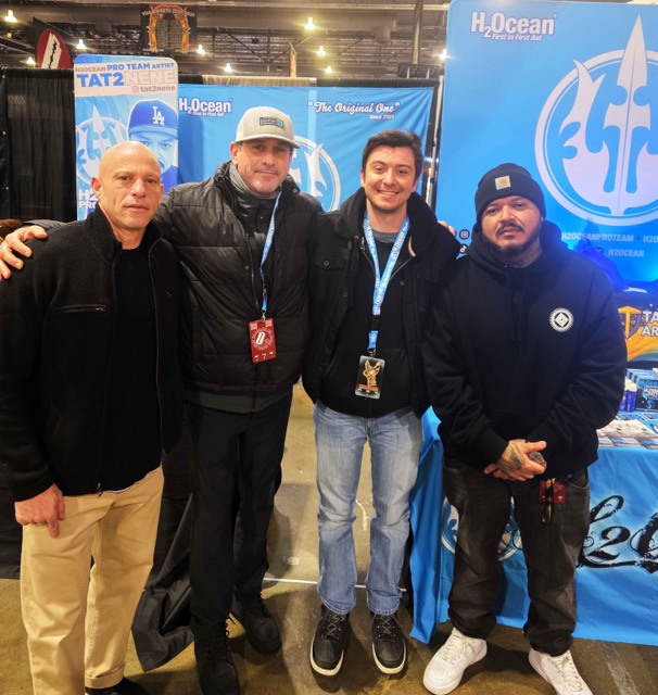 Company leadership attended the event in person, reinforcing H2Ocean’s close connection with the tattoo community. Eddie Kolos, CEO, and Tristan Kolos, Supply Chain Manager, met directly with artists, distributors, and shop owners to gather feedback and discuss evolving aftercare needs. Live tattoo demonstrations were performed in the booth by respected artist Tat2 Nene, while sponsored artists including Ian Bell, James Vaughn, Jessie Levitt, and Brookelle Bombshell engaged with attendees throughout the weekend. A member of the H2Ocean Pro Team also served as a judge for the convention’s tattoo competition.
